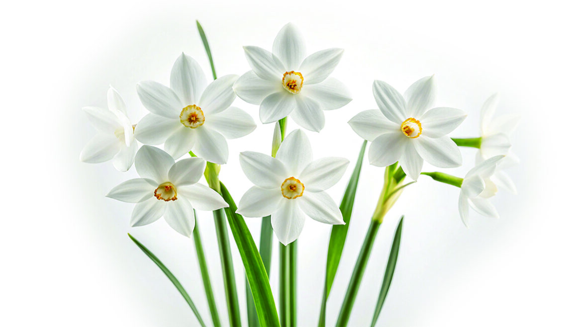 Paperwhites belong to the daffodil family and are associated with the winter holiday season. Paperwhites are also smaller members of the Narcissus family. They have a bell-shaped center surrounded by six petals.